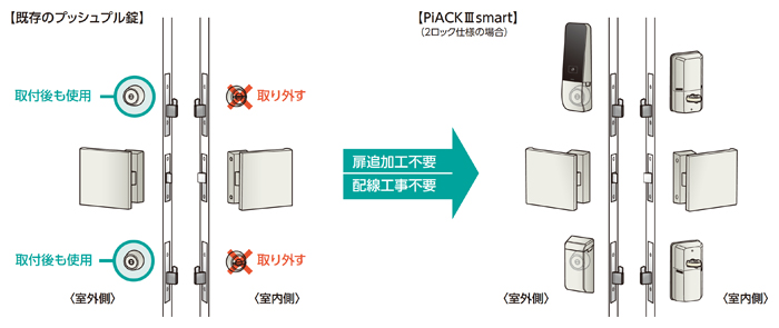 PiACK III smartは、IDカードをかざすノンタッチ方式、テンキーを使用した暗証番号方式の2つの認証方式と、スマートフォンからも認証できる電池式スマートロックです。ロック内に搭載したドア開閉センターによる自動施錠に対応し、セキュリティ性が向上。1ロック/2ロック仕様のどちらもドア加工および配線工事が不要で、既存のドアがプッシュプルでも、レバーハンドルでも後付けが可能。新築、賃貸、既存物件へと幅広く導入できます。